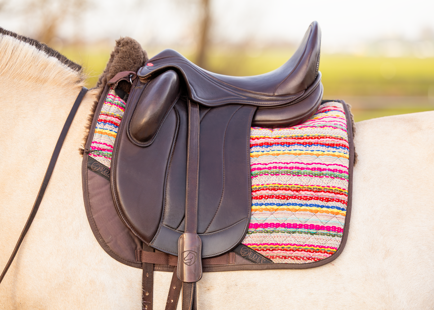 The EDIX® dressage pads fit under a wide array of dressage saddles, and the 8-pocket system makes the pad suitable for use under both treeless and traditional saddles.