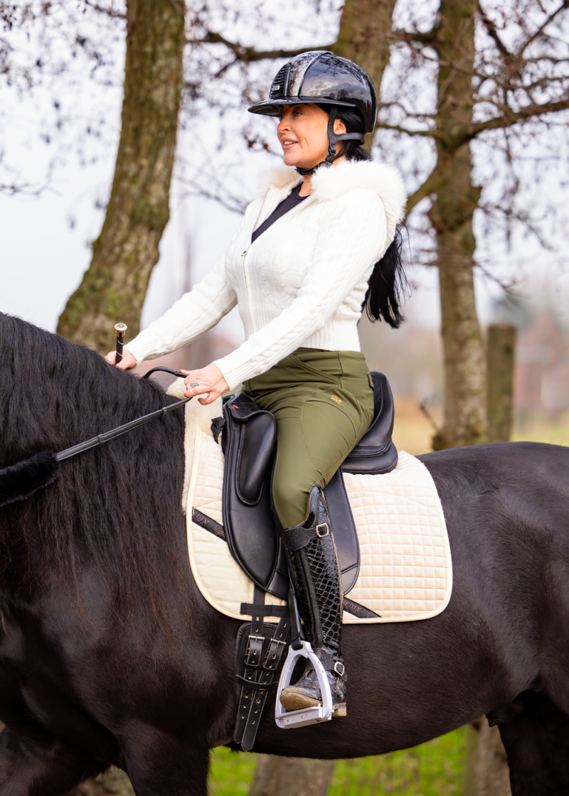 Hoogwaardige Merinowol is technisch gezien waarschijnlijk nog steeds een van de meest geavanceerde materialen ter wereld. Doordat in plaats van geschoren en geweven wol het volledige lamsvachtvel wordt gebruikt, worden de voordelen van dit natuurlijke materiaal optimaal benut. Daarom raden wij aan om het direct op de rug van het paard te gebruiken.