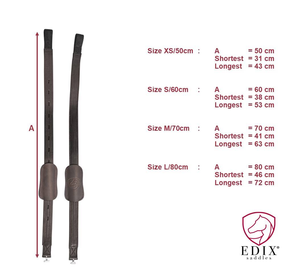 De EDIX T-bar stijgbeugelriemen zijn verkrijgbaar in de kleuren bruin en zwart en in de maten extra kort (50 cm), kort (60 cm), normaal (70 cm) en lang (80 cm).