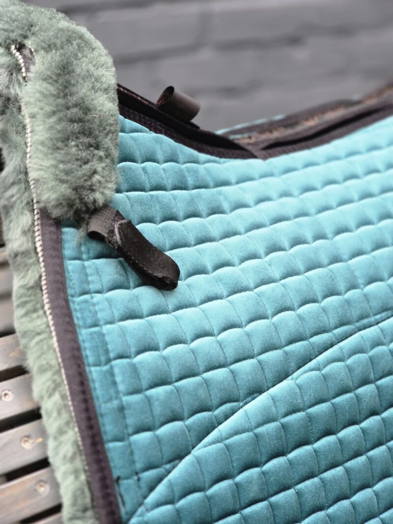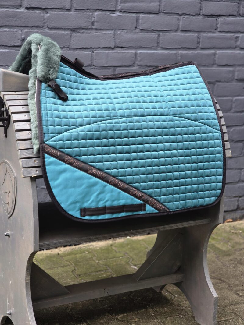 De basis heeft een bontkraag voor extra zachtheid rondom de schoft en is anatomisch gevormd. Aan beide zijden van de rug zijn op de bovenzijde 2 grote en 3 kleine vakken voor inzetstukken, allemaal voorzien van vilten inzetstukken. Uiteraard kan, indien gewenst, een ander type inzetstuk worden gekozen. Omdat de pad 8 inzetvakken heeft, kan hiermee de positie van het zadel worden verbeterd of extra druk worden verdeeld. Op de plek waar het been van de ruiter tijdens het rijden wrijft, is een nylon versterking aangebracht om slijtage te voorkomen. Hoogwaardig Merinowol is technisch gezien nog steeds een van de meest geavanceerde materialen ter wereld. Omdat de volledige lamsvacht wordt gebruikt in plaats van geschoren en geweven wol, worden de voordelen van dit natuurlijke materiaal optimaal benut. Daarom adviseren wij het direct op de rug van het paard te gebruiken. Alle EDIX® Merino pads zijn voorzien van een nieuw ontworpen vrije rugkanaal van kort geschoren vacht, ontwikkeld om drukpunten te verminderen en optimale bescherming van de wervelkolom van uw paard te bieden. Daarnaast heeft de Merino vacht een groot oppervlak zodat de zadelpanelen volledig op de pad rusten. Hierdoor wordt transpiratie effectief naar buiten afgevoerd, terwijl tegelijkertijd de druk wordt verdeeld en schokken worden geabsorbeerd. De EDIX® dressage pads passen onder een breed scala aan dressuurzadels, en het 8-vaksysteem maakt de pad geschikt voor gebruik onder zowel boomloze als traditionele zadels.
